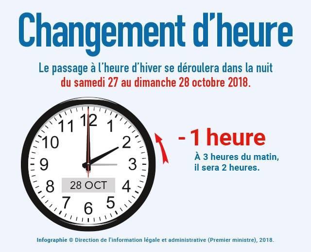 Dans la nuit du samedi 29 octobre au dimanche 30 octobre 2022 la France et le reste de lUnion européenne se plieront une nouvelle fois au changement dheure dhiver. Avancer lheure dans la nuit du 12 au 13 mars 2022 Reculer lheure dans la nuit du 5 au 6 novembre 2022. Changements dheure au Québec en 2022.